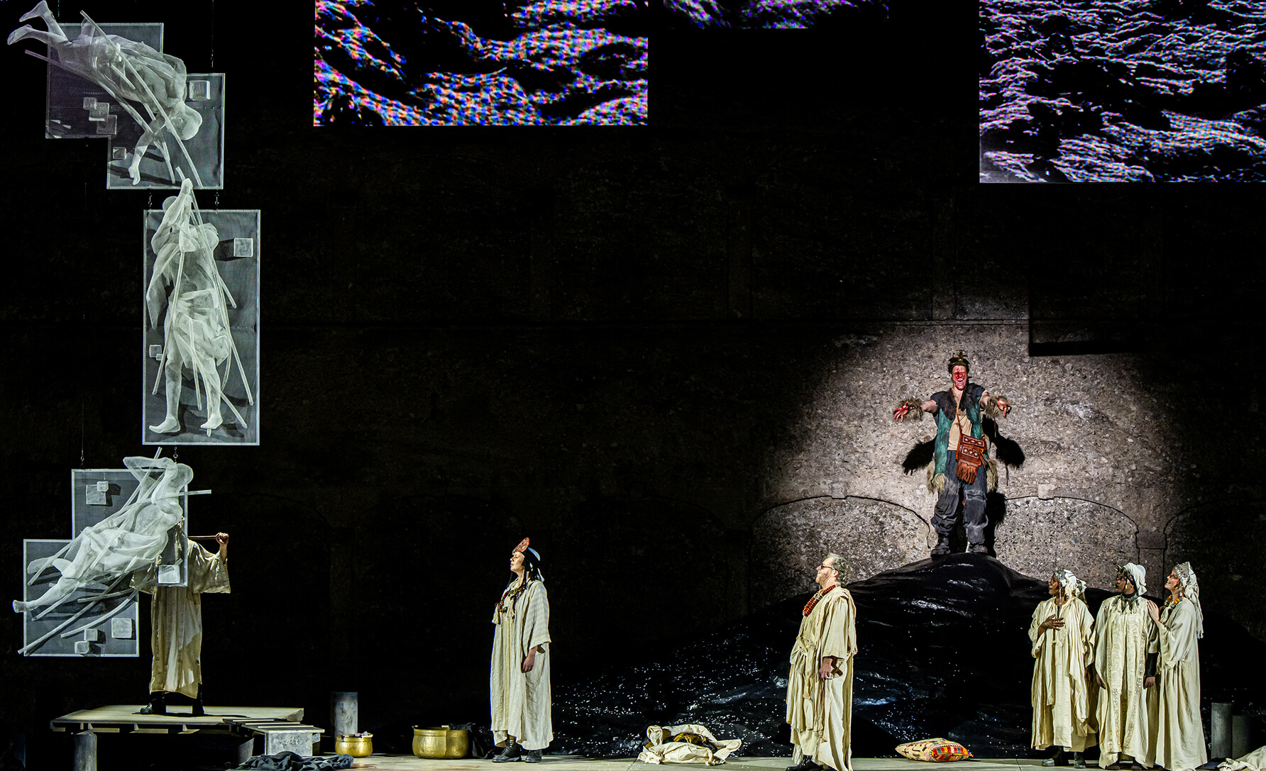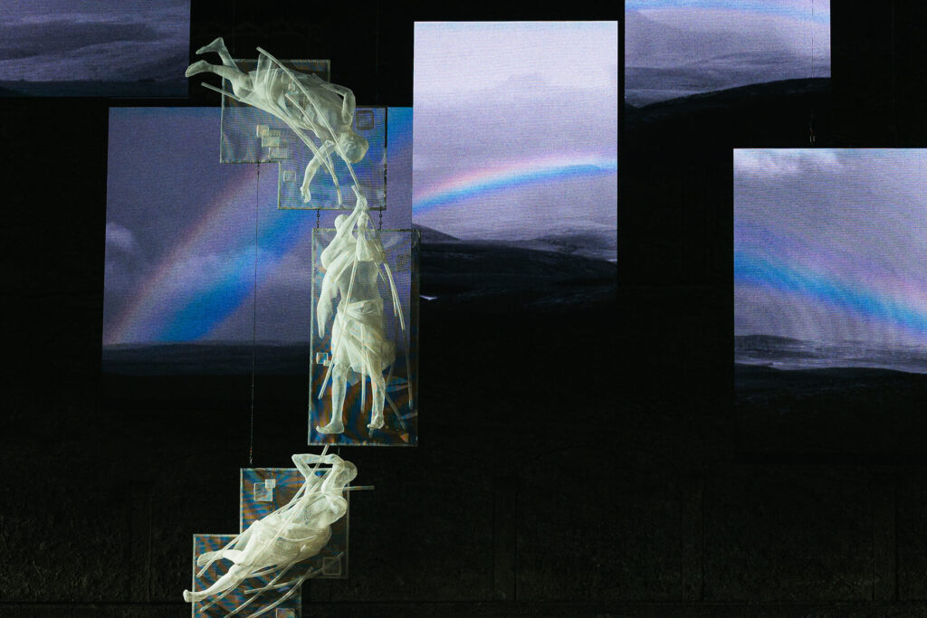 “Das Rheingold, as staged by Kirill Serebrennikov, unfolds in a future that feels both apocalyptic and fragile — a kind of post-post era in which humanity has already passed through all cycles of civilisation and begins to return to a more primitive state. Within this world, familiar fragments of culture and belief seem to have lost their original meaning and reappear as relics, symbols, or ruins of something transformed beyond recognition. Our work responds to this atmosphere, helping to create a sense of a world suspended between the remnants of the old and the emergence of the new.” — Recycle Group